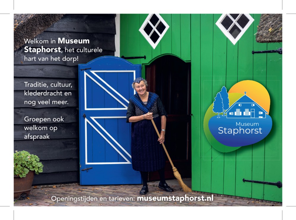 Museum Staphorst is het culturele hart van het dorp. Er is een authentiek ingericht voorhuis van een boerderij, interessante thematentoonstellingen, verdiepende films over de geschiedenis van het dorp en leuke activiteiten voor kinderen. Van harte welkom in Staphorst!